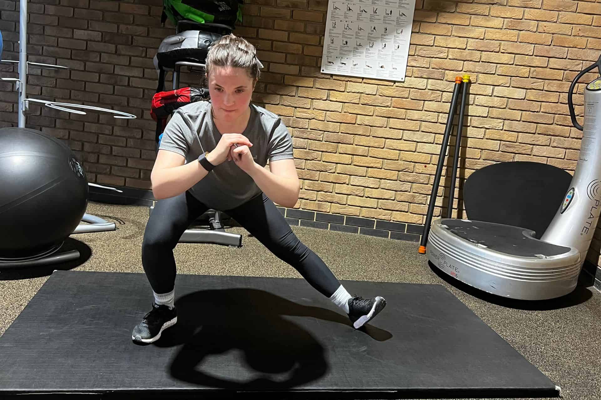 - Slowly shift your weight to your right leg, bending your right knee and sitting your hips down – keep your torso upright and your left leg completely straight
