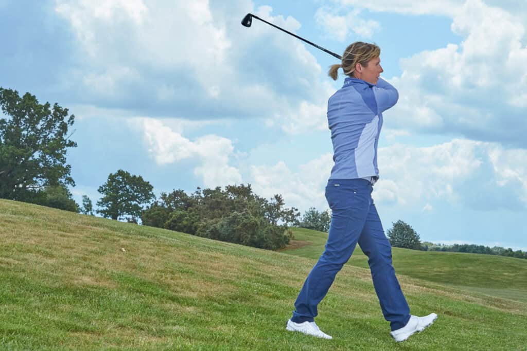 Many women lift onto their toes on the downswing and don’t use the ground to generate power. The body is then too square on and the hips cannot open. This drill will help with power and balance. If you have a tendency to fall forward and to the right (if you are right-handed) in your follow through, then this is the one for you!