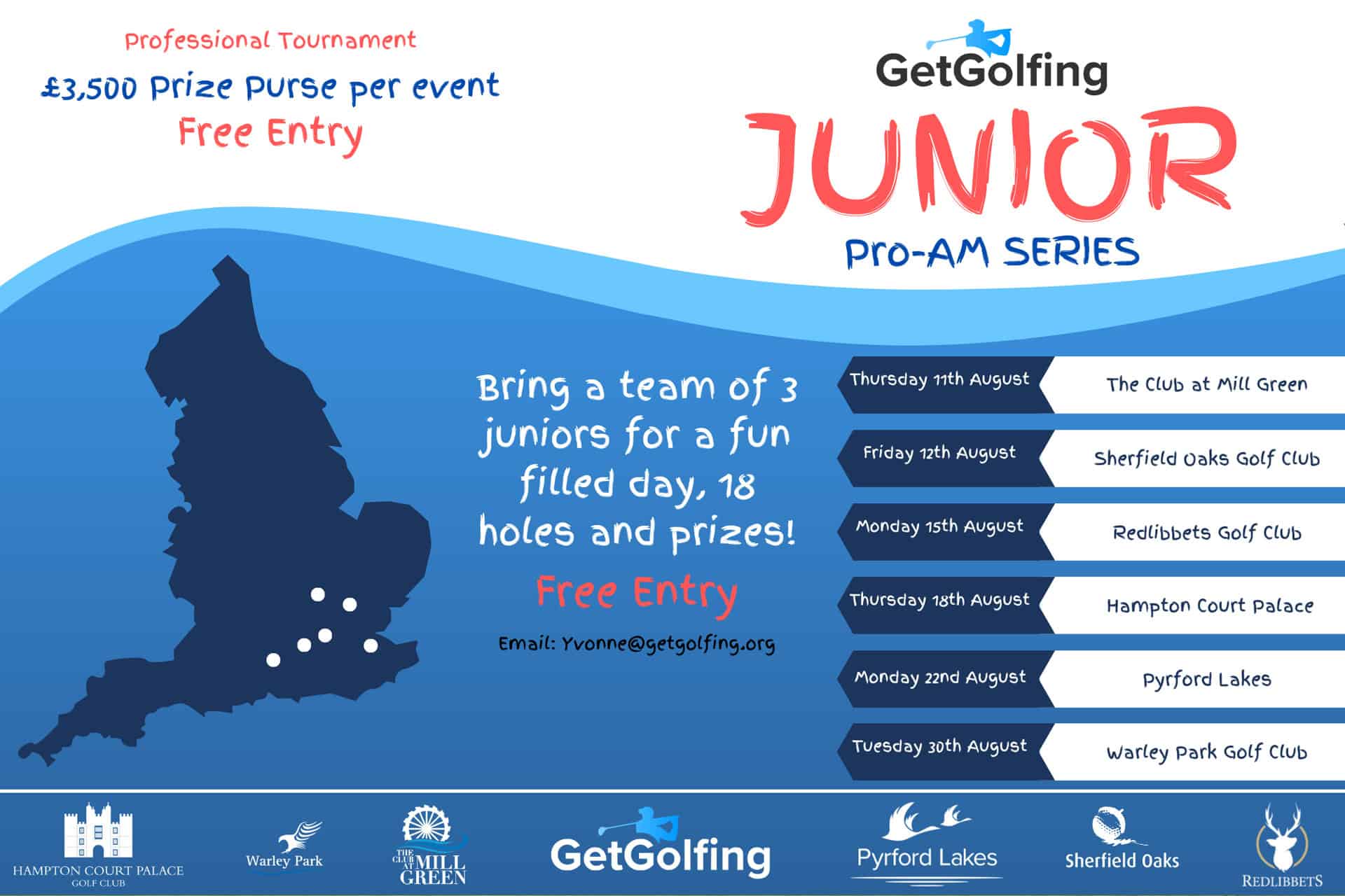 Get Golfing is proud to announce the launch of six Junior Pro-Am events this August. They are looking to get as many juniors as possible to play in these events, which are running through the summer holidays. Plus they are all FREE to enter.