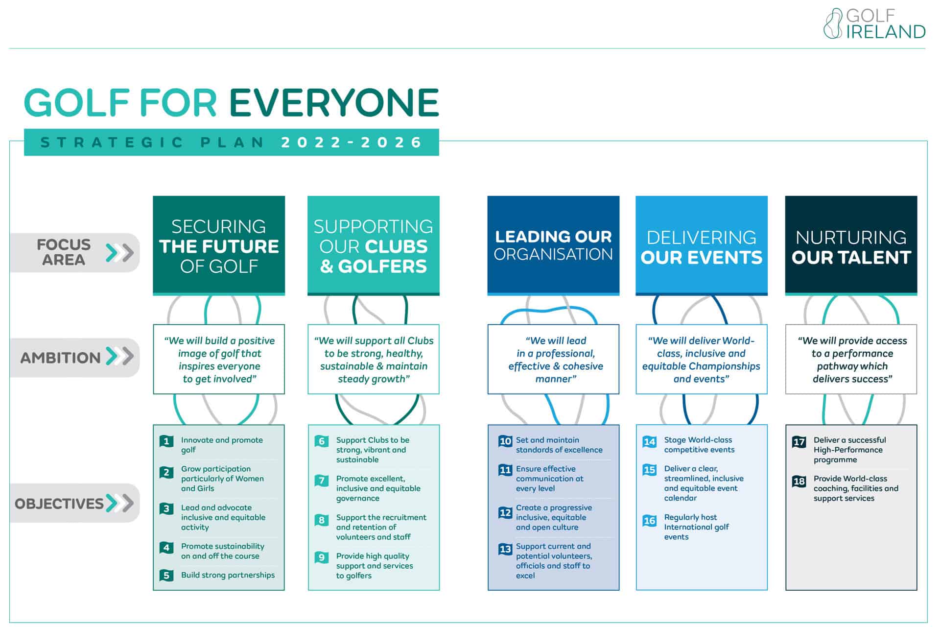 “Golf is a game for everyone – for enjoyment, for health, for life”, is the Vision of the Strategic Plan, with five focus areas set out throughout the Strategy.