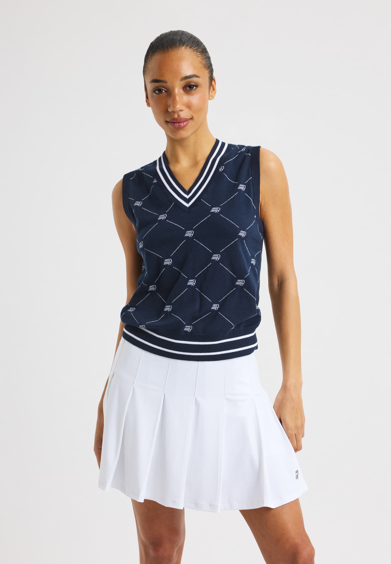 A classic knitted golf vest designed for a timeless, preppy look on and off the course. Made from a soft blend of organic and combed cotton, it offers comfortable wear with a refined finish. Featuring a jacquard-knit Röhnisch pattern and a clean regular fit, this vest is a fully sustainable choice.